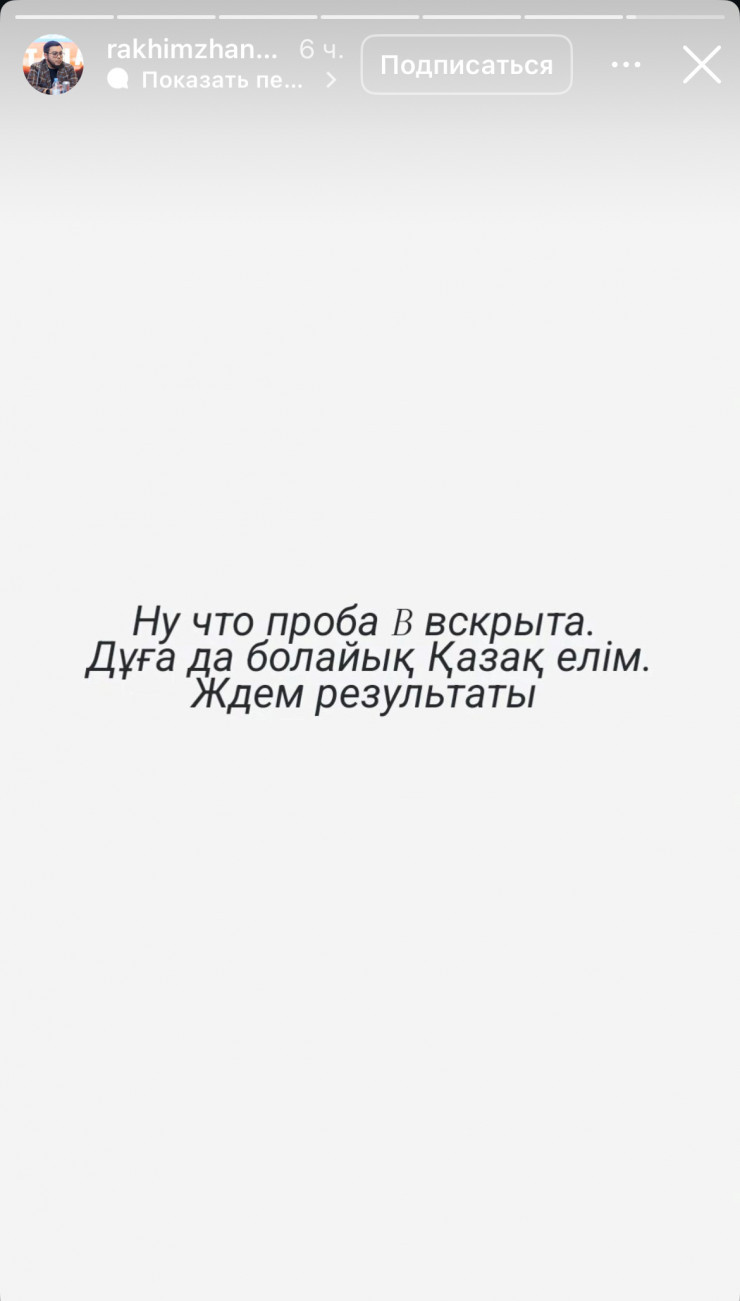 "Сонымен, B сынамасы ашылды. Қазақстан халқы, дұғада болайық. Нәтижесін күтеміз", — деп жазды спорт функционері әлеуметтік желідегі парақшасында.