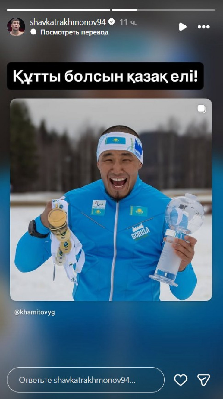 UFC-дің қазақстандық файтері Шавкат Рахмонов Италияда өткен Паралимпиада-2026 ойындарында жүлде алған отандастарын құттықтады, деп хабарлайды Vesti.kz.